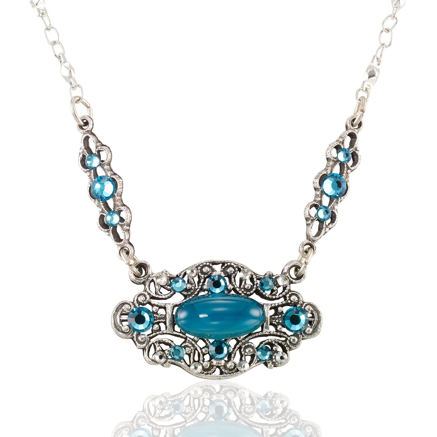Featuring a delicate antique-style metalwork design, this necklace showcases a vintage green glass stone, surrounded by shimmering crystals. This is a perfect piece for special occasions or adding a romantic flair to everyday wear. “Over 35 years ago I began designing jewelry and started to buy batches of decorative glass stones to use in my designs, some made as far back as the early 1900’s. Enchanted by these rare works of art, I have created Anne’s Vault, a collection of limited-edition designs using these select pieces of magnificent vintage glass.” -Anne Koplik. Made in the USA with lead/nickel free antiqued silver plated white metal castings and chain. Lobster Claw Closure.