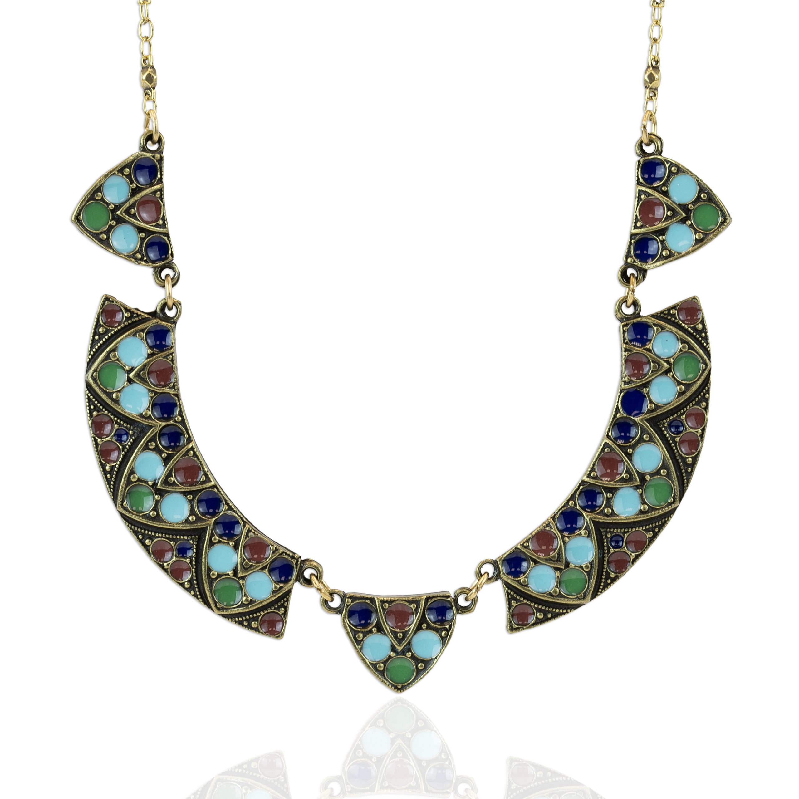 Timeless allure is captured by our Egyptian Revival designs creating a sense of spirituality, protection, and eternal life cycle. This Art Deco styled collar necklace is hand enameled in the traditional colors of the ancient civilization of Carnelian, Lapis Blue, Turquoise, and green to give a the replication of this time period of archeological discovery.
