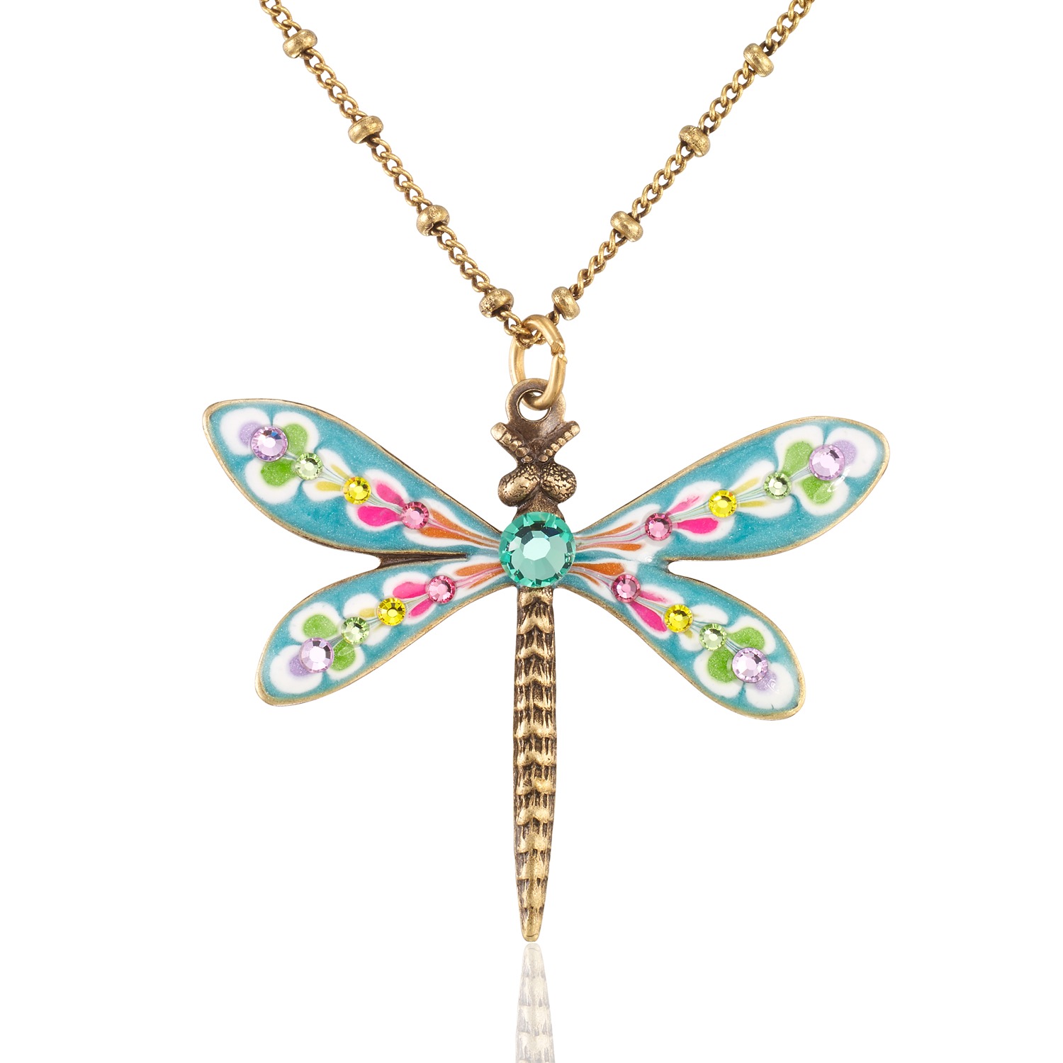 Inspired by the beauty of the spring season, this bright colored and intricately designed dragonfly pendant necklace features colors such as turquoise, pink, purple, green, yellow and orange, accented with brilliant turquoise crystal. Made in the USA with lead/nickel free antiqued brass findings and antiqued brass chain. Lobster claw closure.