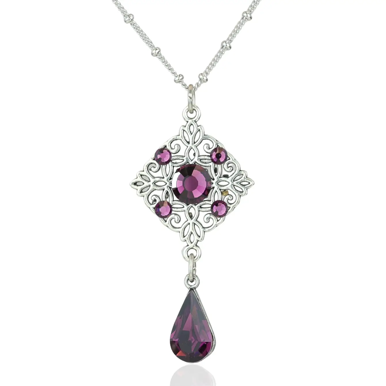 Classic femininity is showcased in this filigree rhombus with vintage inspiration, accented with sparkling amethyst colored crystals and dangling teardrop.