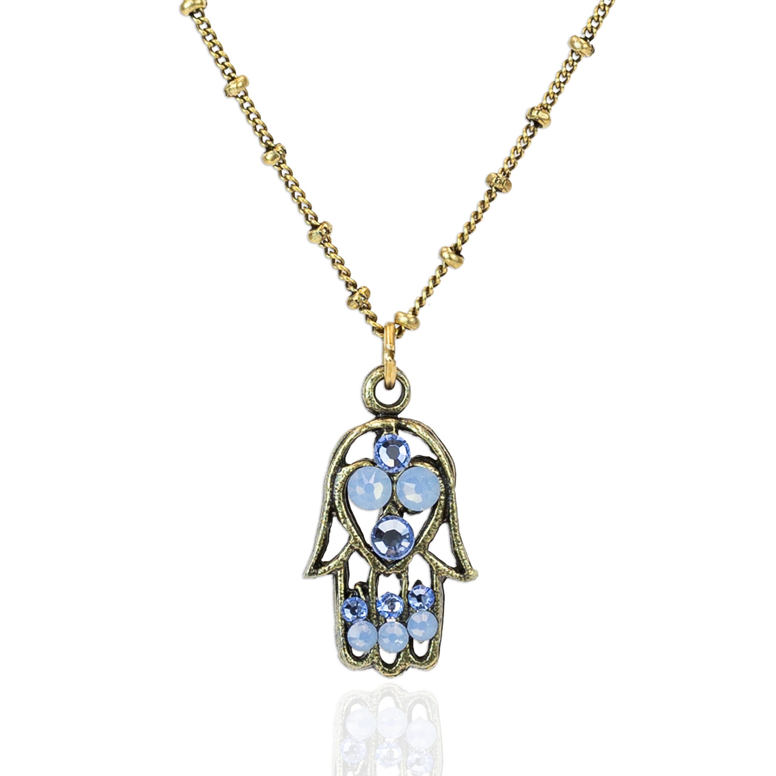 “Though it’s an ancient Middle Eastern symbol, universally, the Hamsa is recognized as an emblem of good luck and protection. Featuring an open Hamsa pendant with center heart detail and light blue crystal accents. This necklace is beautiful representation of this important symbol.