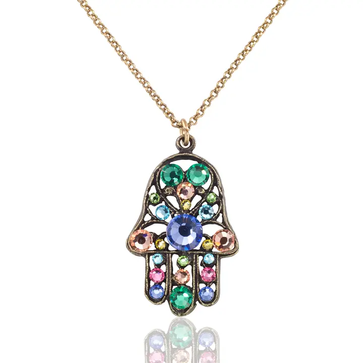 This filigree openwork Hamsa necklace blends timeless symbolism with soft, feminine beauty. The intricately crafted Hamsa pendant features an airy, lace-like design that radiates elegance and grace. Accented with pastel-hued crystals, it sparkles subtly, evoking a sense of serenity and gentle protection. A symbol of luck, protection, and positive energy, this necklace is both a stylish accessory and a meaningful talisman. Made in the USA with lead/nickel free antiqued brass findings and antiqued brass chain. Lobster claw closure.
