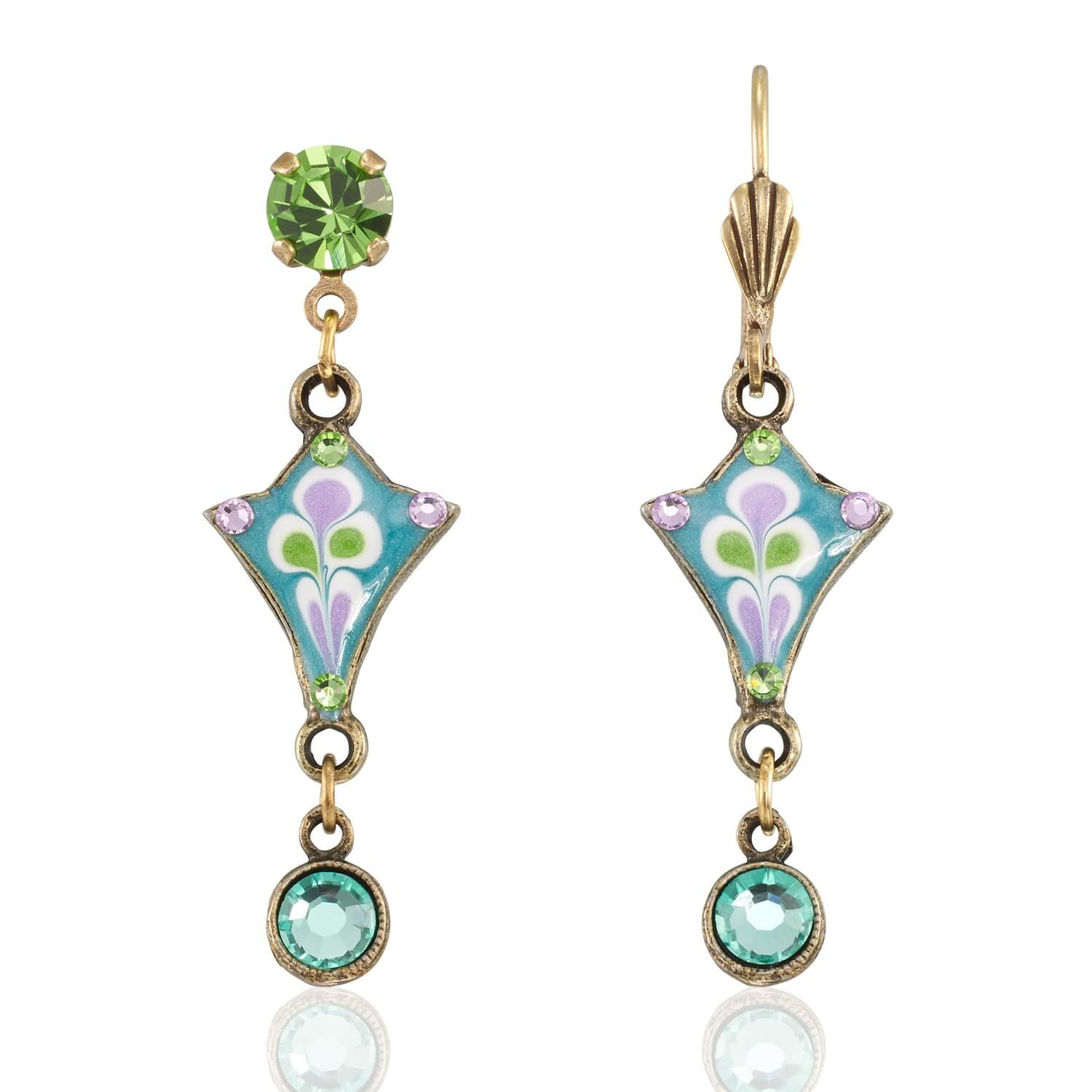 Bright, bold and radiant, the turquoise flying purple floral kite crystal drop earrings are the perfect bit of color and sparkle this spring. Made in the USA with antiqued brass lead/nickel free white metal castings.