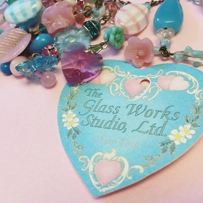 I purchased a beautiful, long necklace and a pair of matching earrings at an estate sale in Tyler, Texas. The necklace has the Glass Works tag on it. It is a necklace full of hearts in the brass tones and glass. The glass hearts are mostly shades of blue and green. It is beautiful! I am so happy with my estate sale find! Tell your Mom thank you for making it!